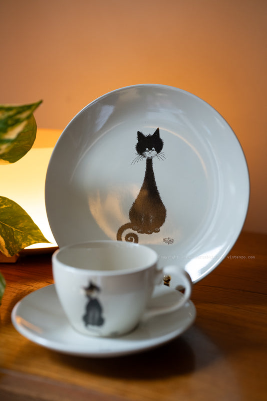 Vintage Decorative Cat Illustration Ceramic Albert Dubout Plate and cup with saucer