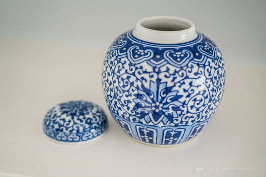 Vintage Blue and White Tangled Branches and Lotus Lid Jar
