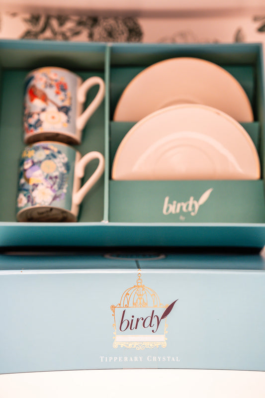 Tipperary Crystal Birdy Set of 2 Espresso Teacups with Saucers