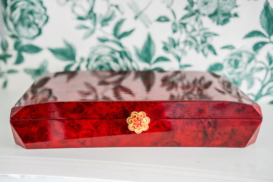 Large Vintage Lacquered Wooden Jewellery Box in Red Roses Pattern
