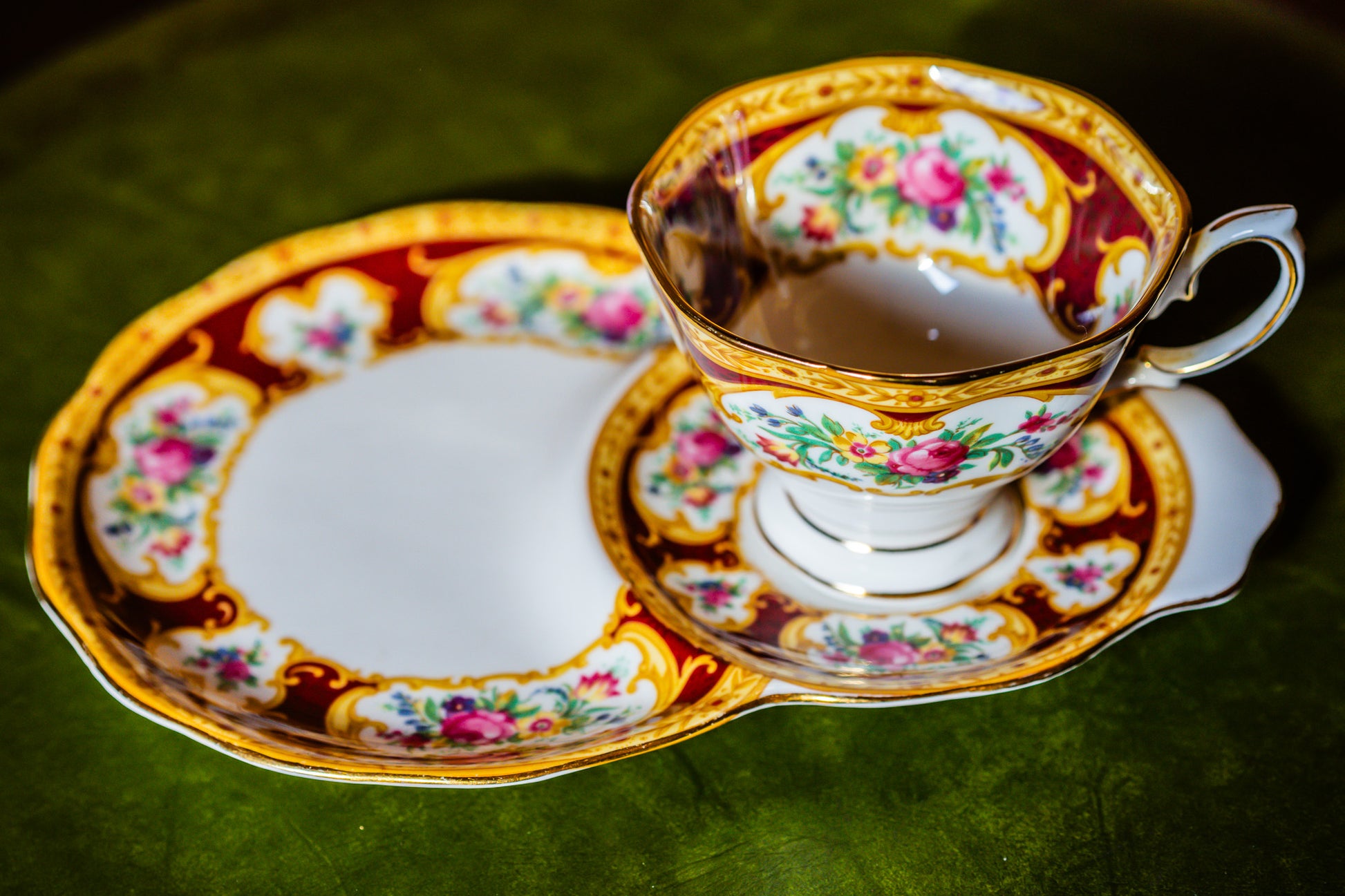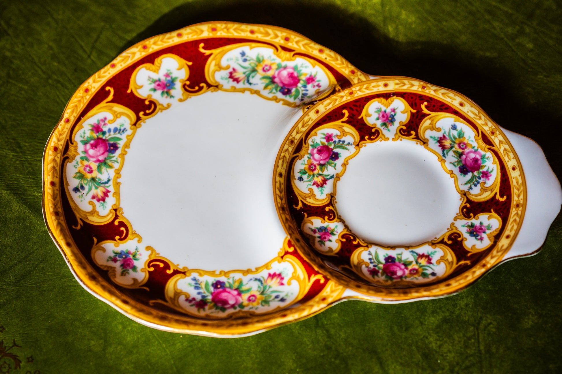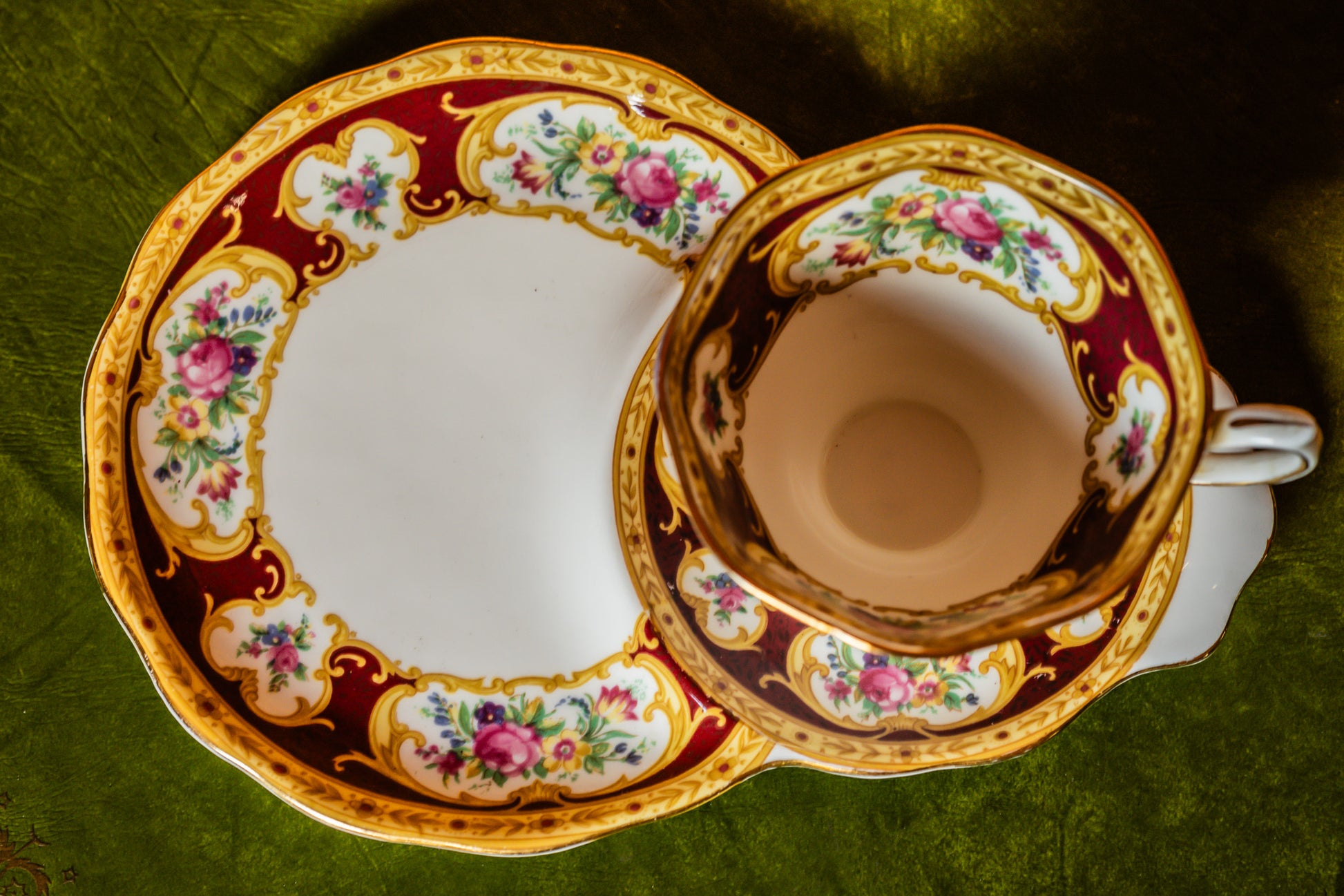Discover the elegance of the rare Royal Albert Lady Hamilton breakfast set, featuring a beautifully crafted teacup and matching saucer with an extra room for a sandwich or cake. The Lady Hamilton pattern is renowned for its rich, floral design, showcasing vibrant pink roses and delicate greenery set against a deep burgundy and cream background. Each piece is finely detailed with luxurious gold trim, adding a regal touch to this already sophisticated set.