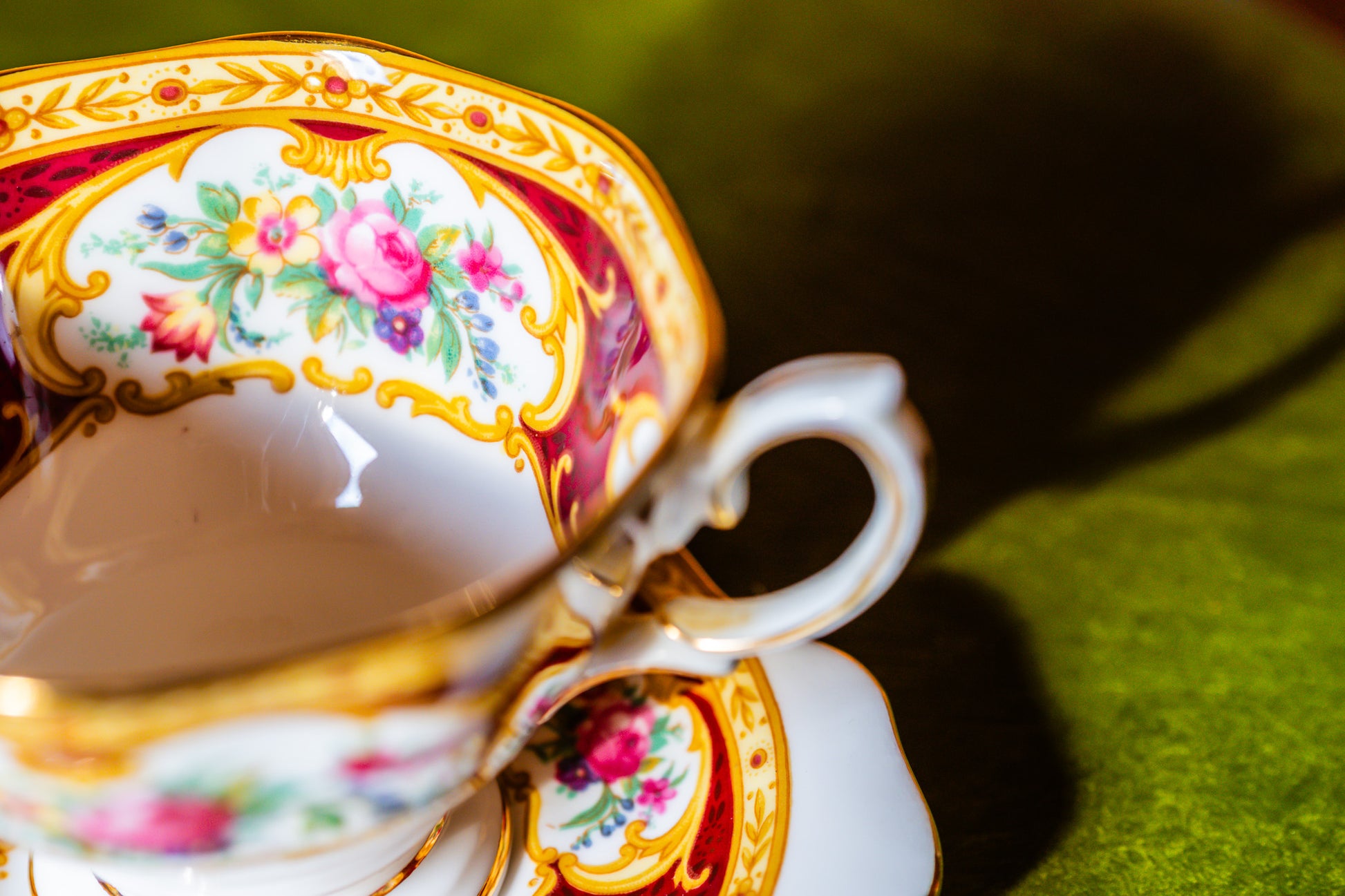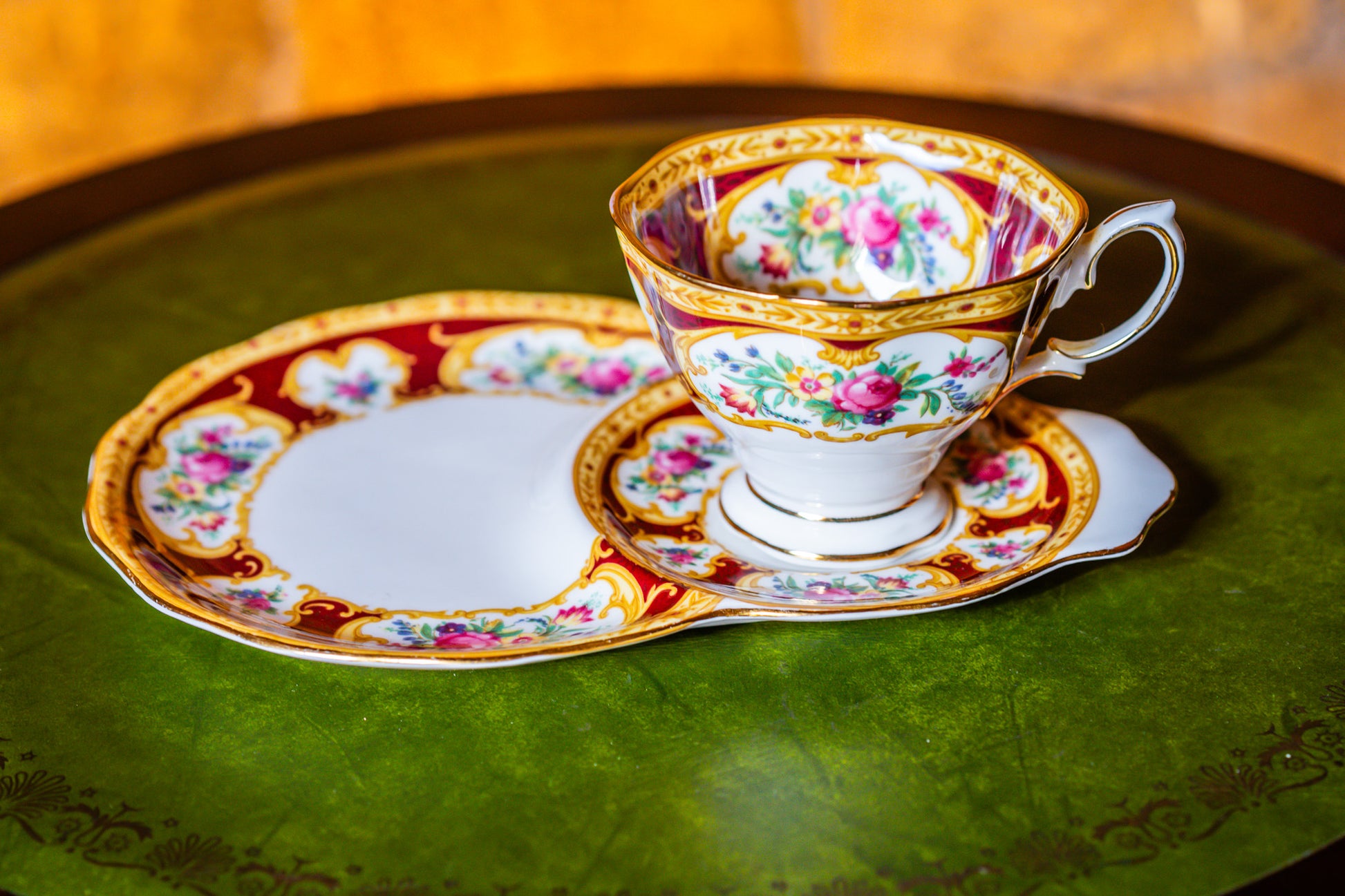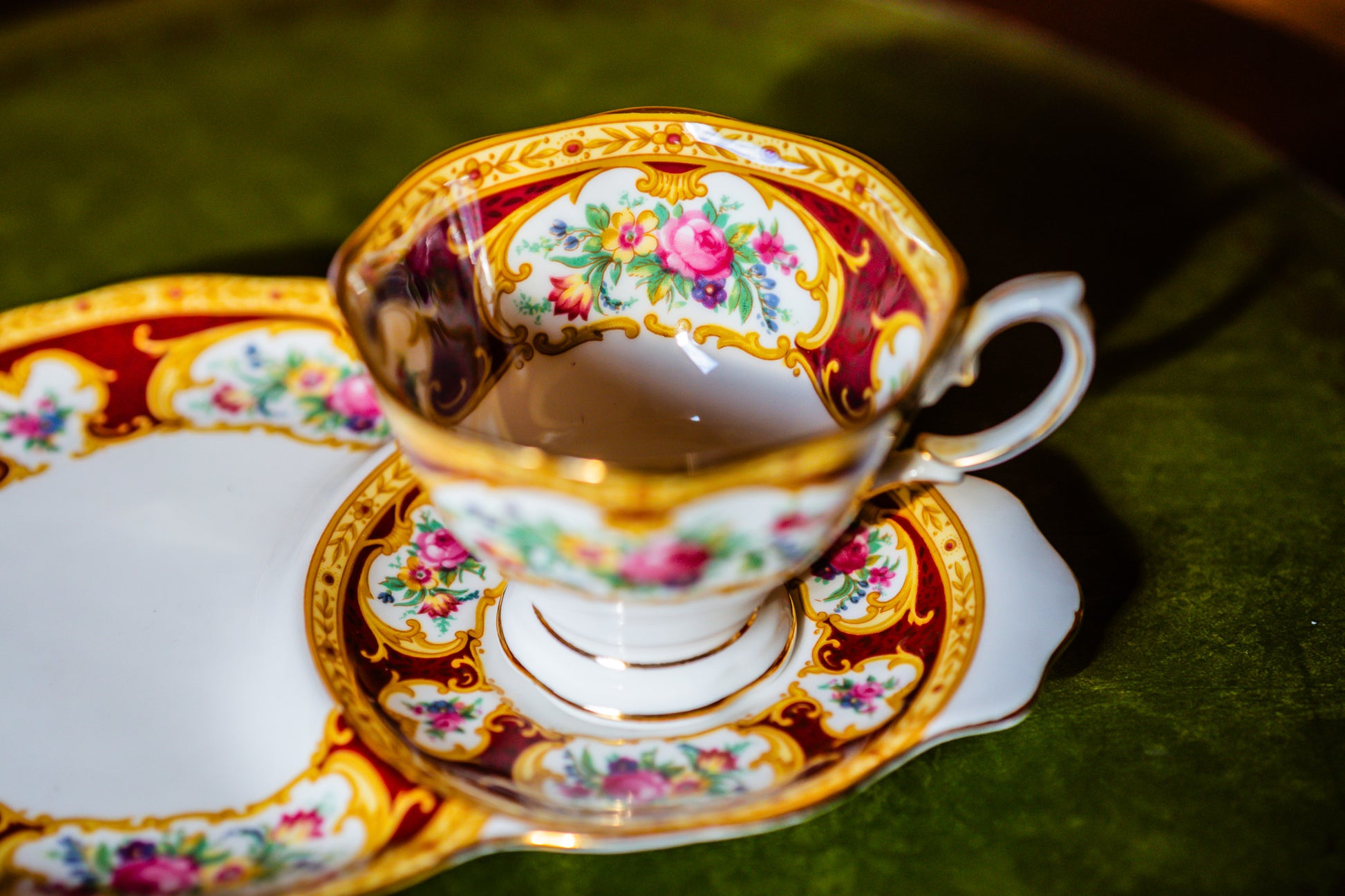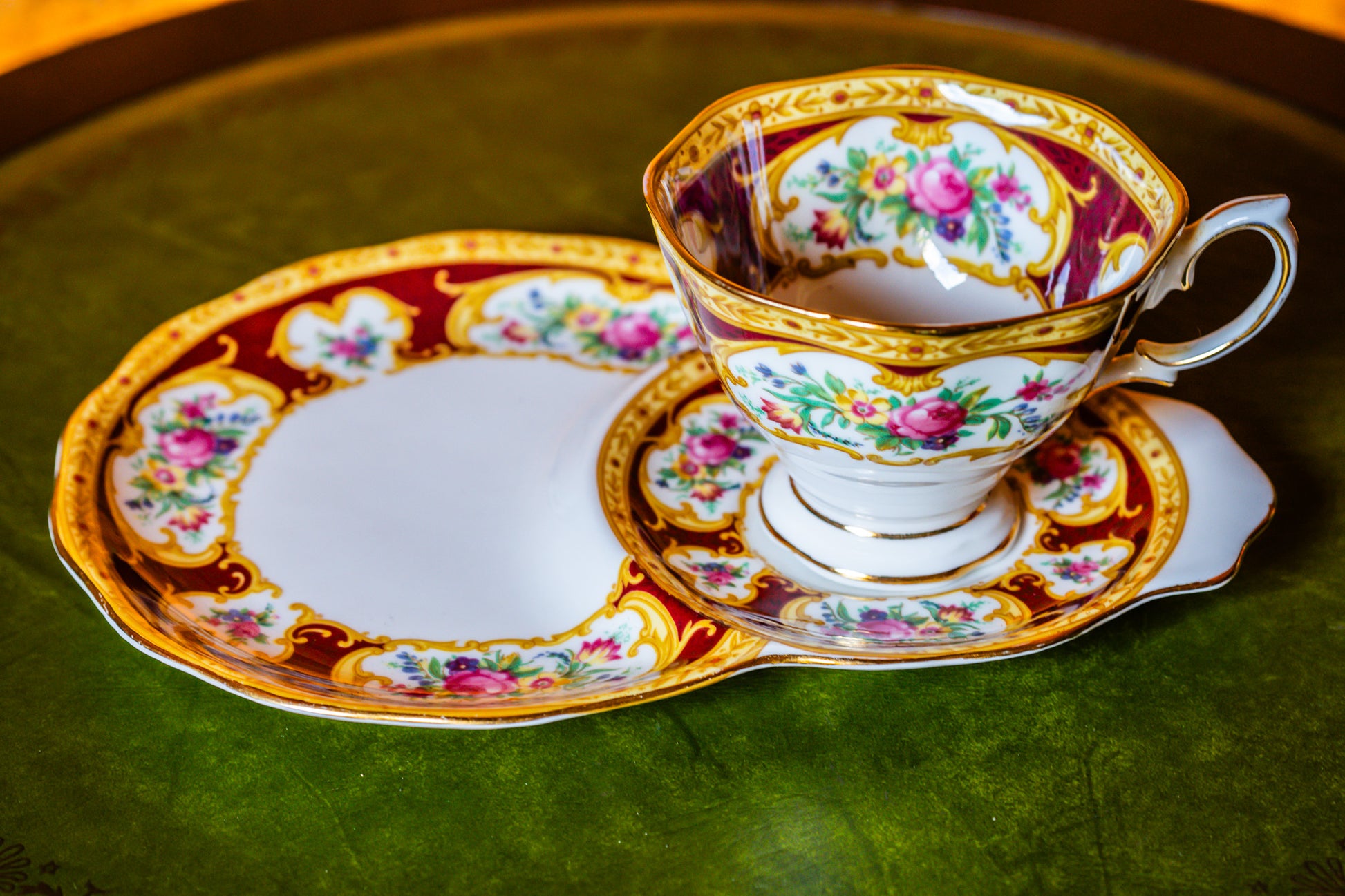Discover the elegance of the rare Royal Albert Lady Hamilton breakfast set, featuring a beautifully crafted teacup and matching saucer with an extra room for a sandwich or cake. The Lady Hamilton pattern is renowned for its rich, floral design, showcasing vibrant pink roses and delicate greenery set against a deep burgundy and cream background. Each piece is finely detailed with luxurious gold trim, adding a regal touch to this already sophisticated set.