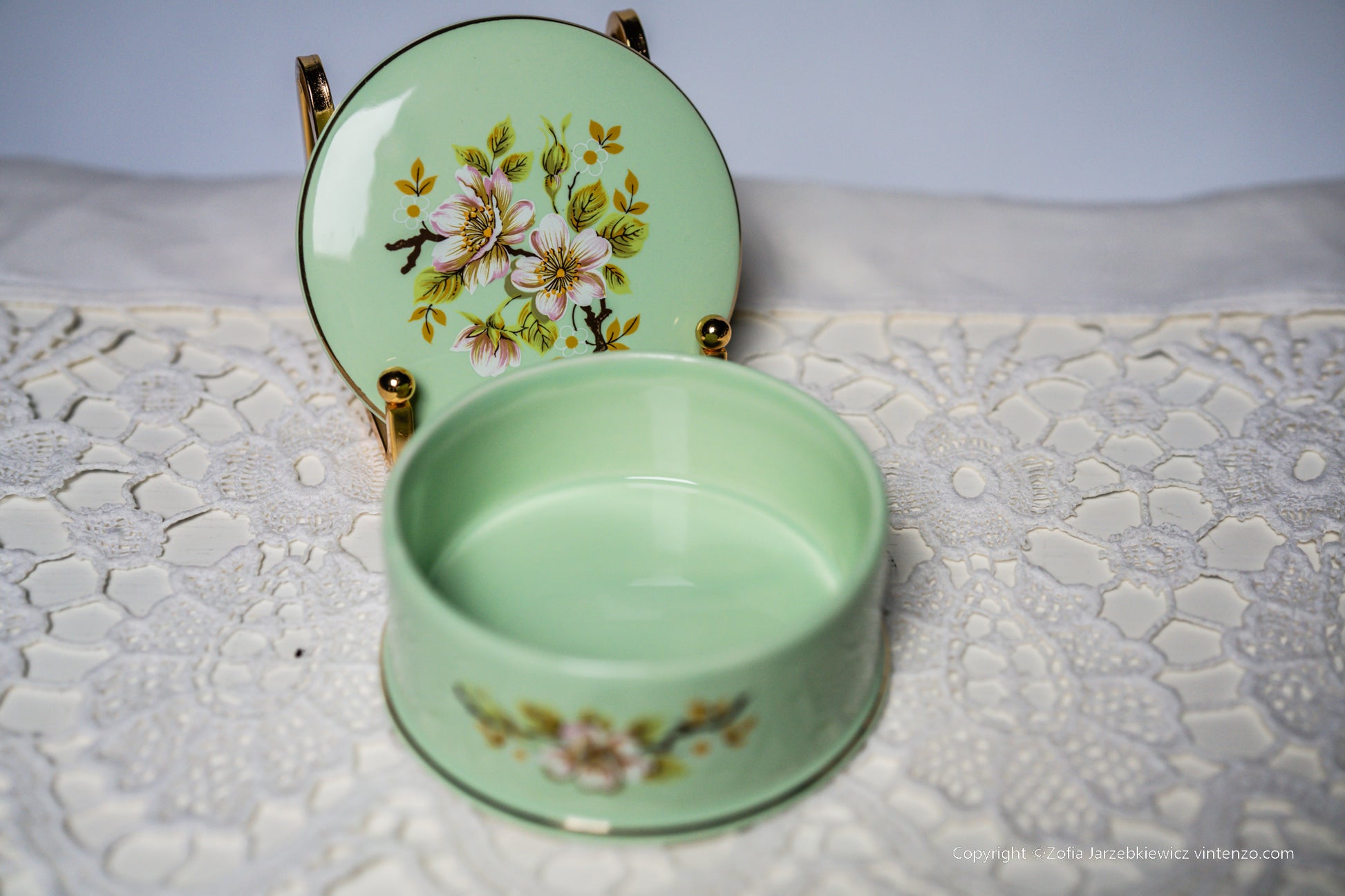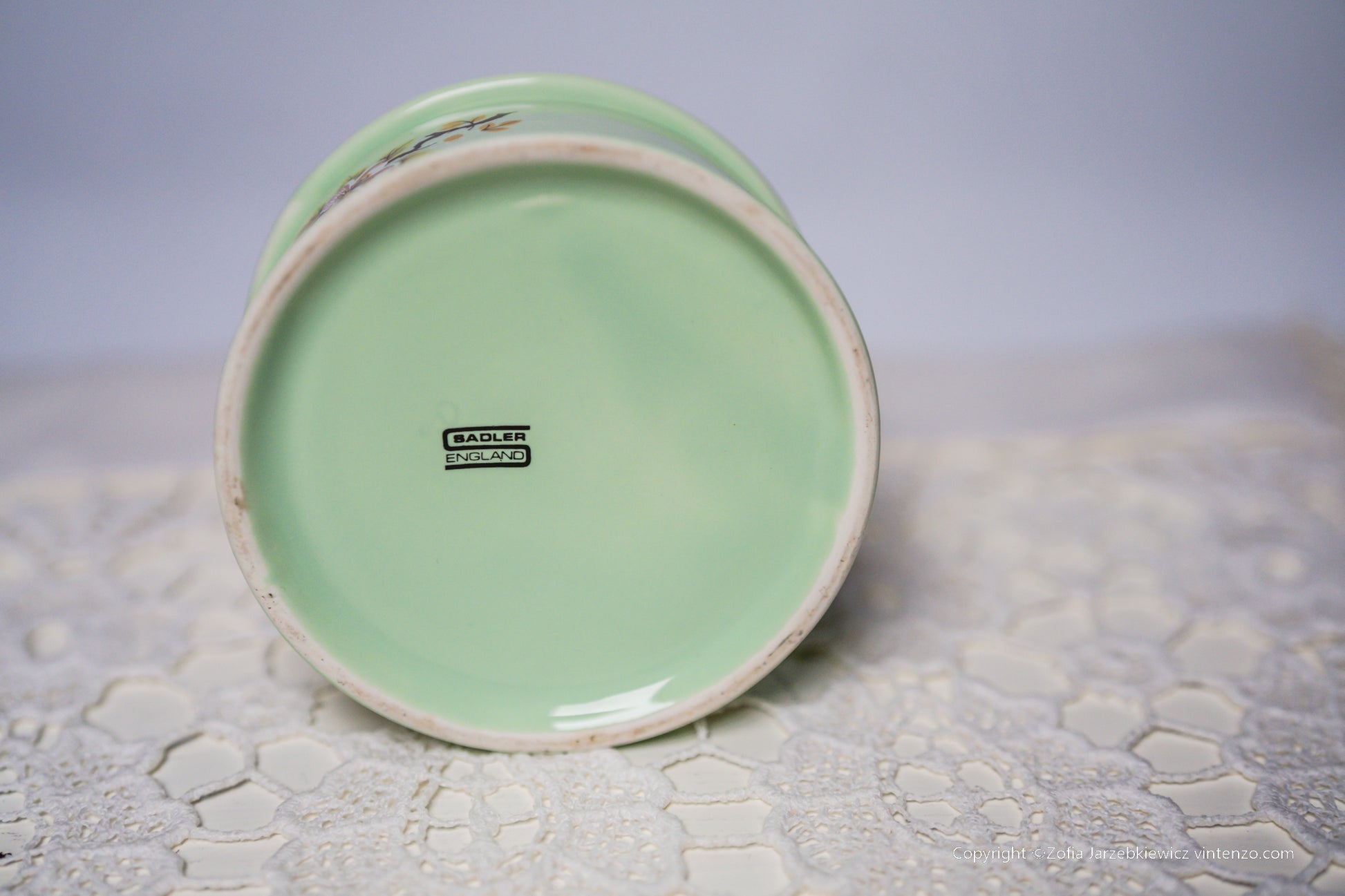Crafted by Sadler, a well-known English pottery brand, this ceramic trinket box features a delicate green floral design on a soft, pastel background. The detailed flowers add an elegant and timeless touch, making it a beautiful addition to any vanity, dresser, or collection.