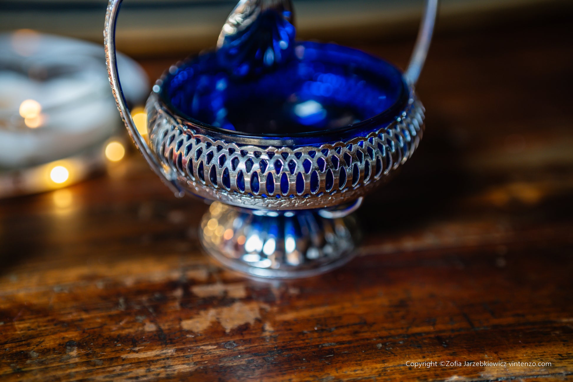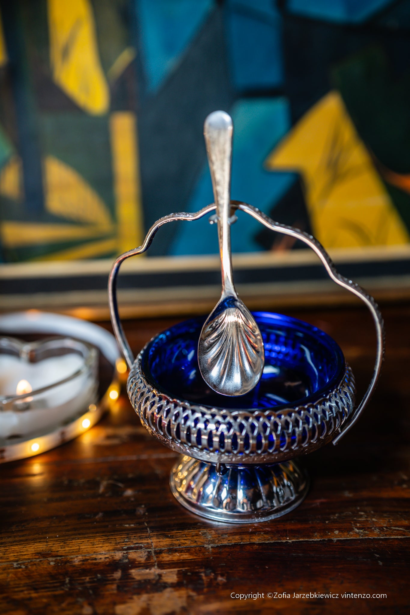 A refined vintage piece showcasing a beautifully crafted silver-plated frame and a vibrant blue glass insert. Complete with a matching spoon, this sugar bowl adds timeless elegance to tea time or table decor.