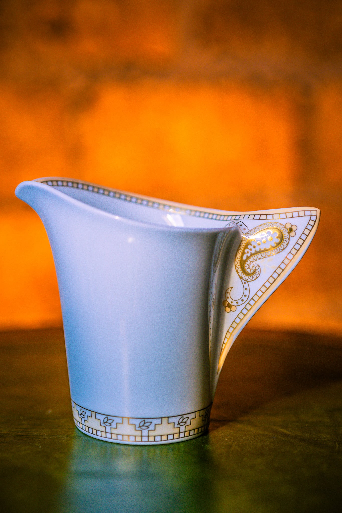 Add a touch of modern elegance to your table with this Villeroy & Boch New Wave Samarah creamer. Featuring the signature flowing lines of the New Wave collection, this creamer stands out with its sleek, asymmetrical design. The Samarah motif, with its intricate golden and beige geometric patterns, enhances the contemporary shape, offering a blend of style and sophistication.