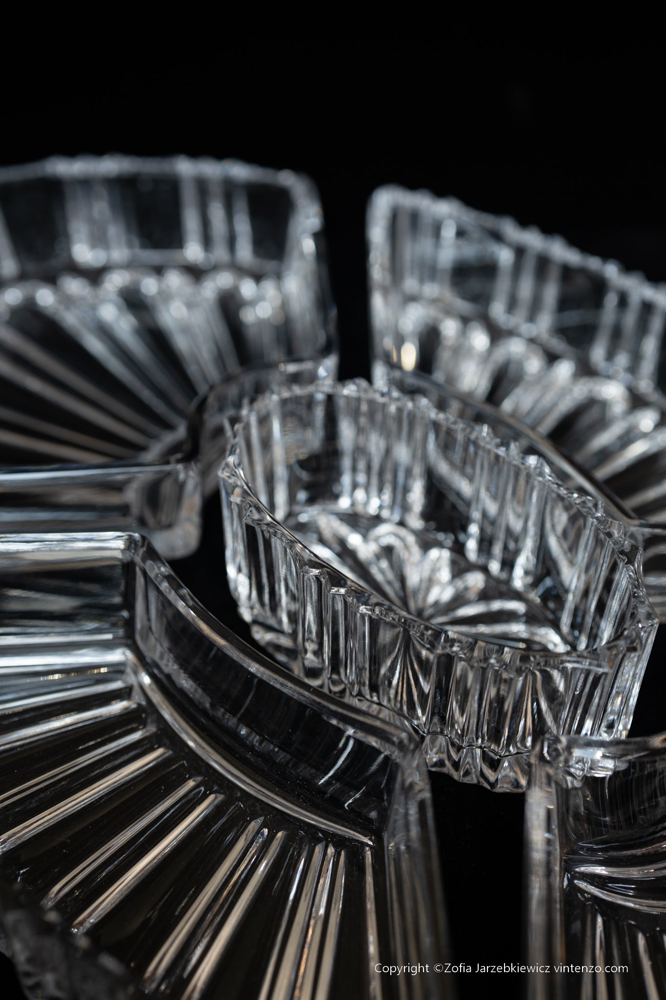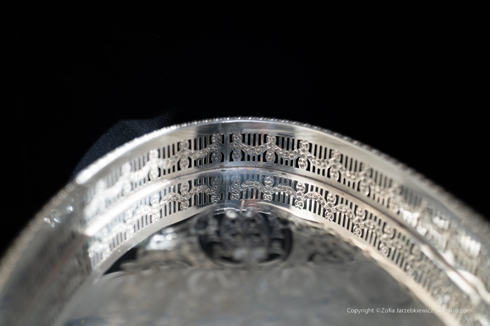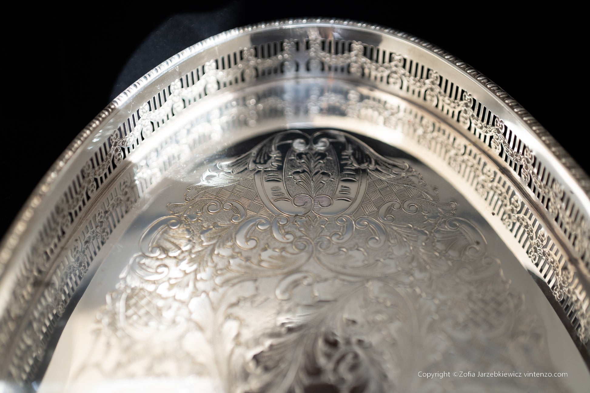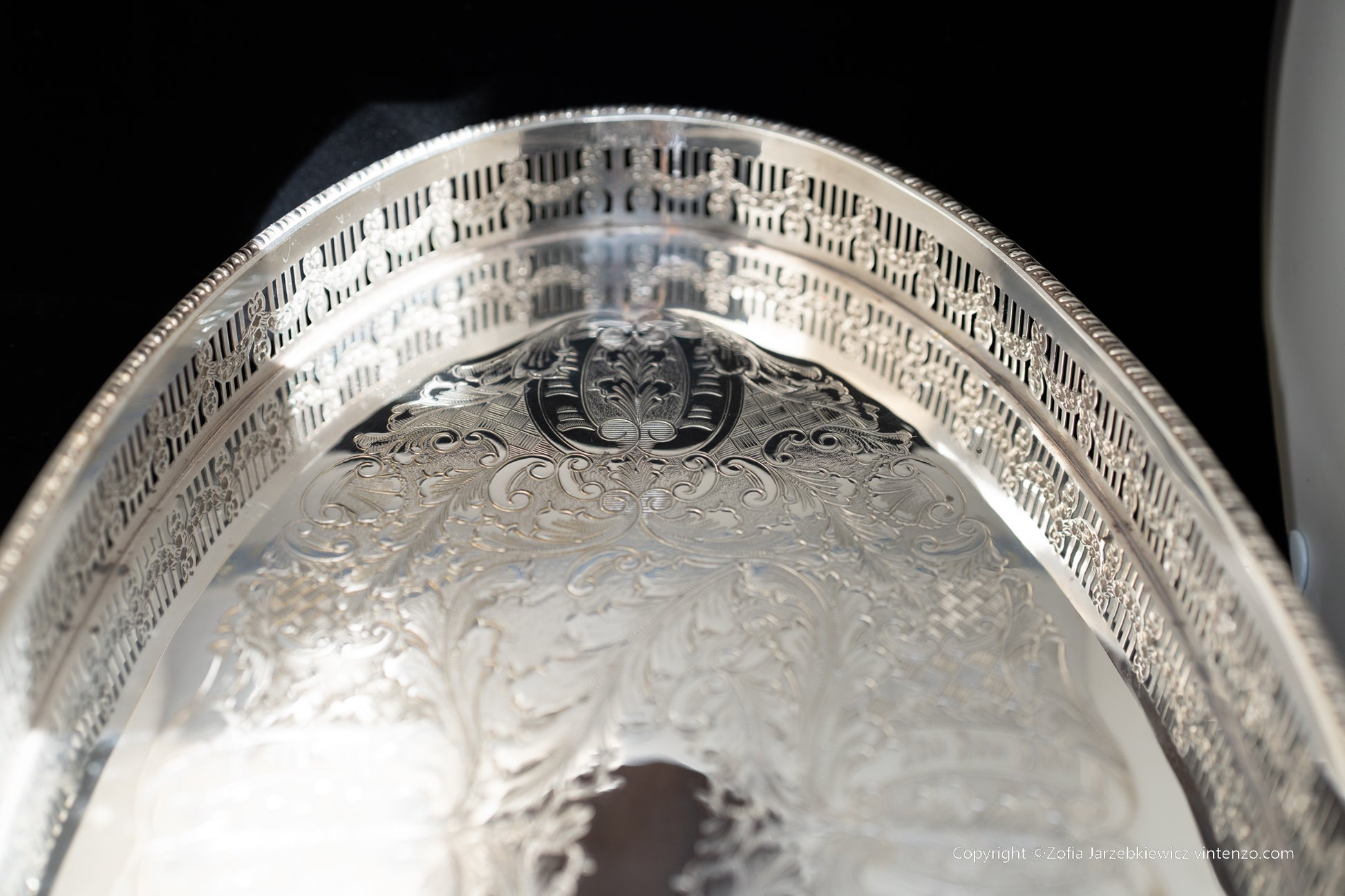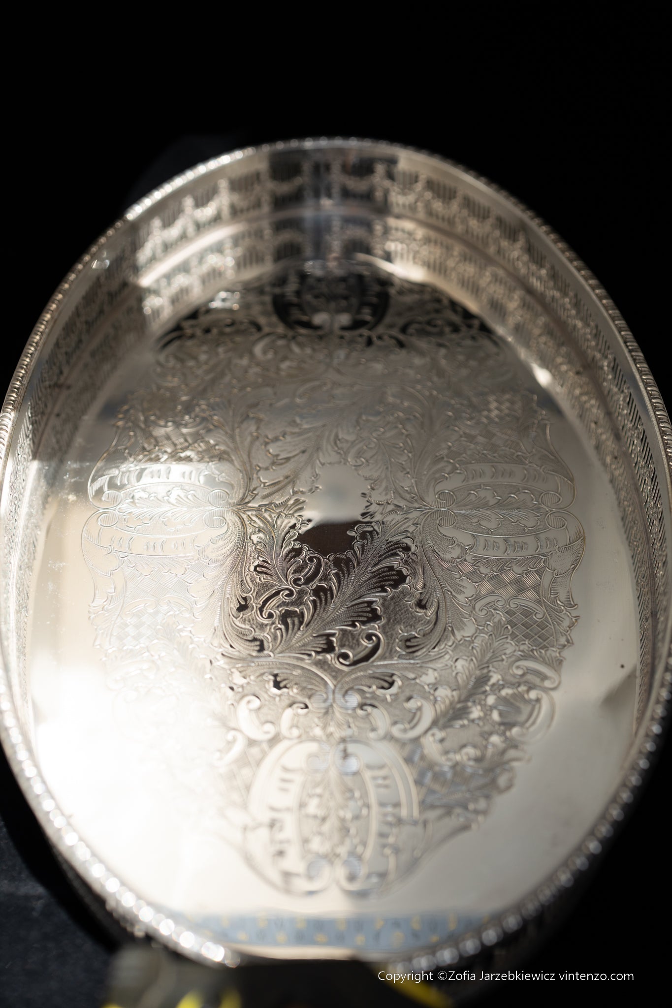 This elegant vintage silver plated tray by Viners of Sheffield showcases timeless British craftsmanship. The oval tray features intricate detailing along the rim and it's perfect for serving in style or displaying on a sideboard. It comes complete with five original crystal glass serving dishes, beautifully cut to catch the light and complement the tray’s polished finish. Ideal for entertaining or as a striking decorative piece.