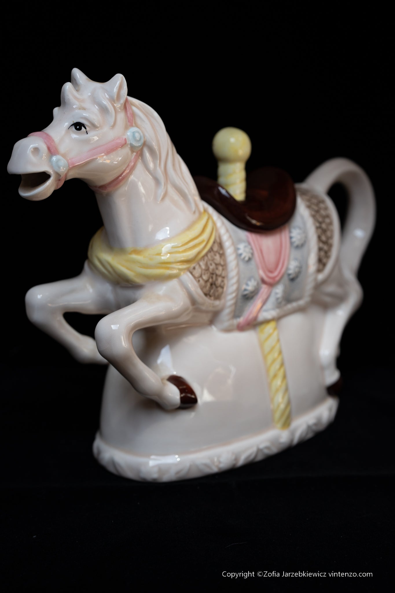 Whimsical Vintage Carousel Horse Teapot by Heritage Mint, featuring a beautifully detailed carousel horse design with vibrant colors and gold accents. A charming collectible or display piece that brings a touch of nostalgia and elegance. Please review the photos closely, as they are an important part of the description.