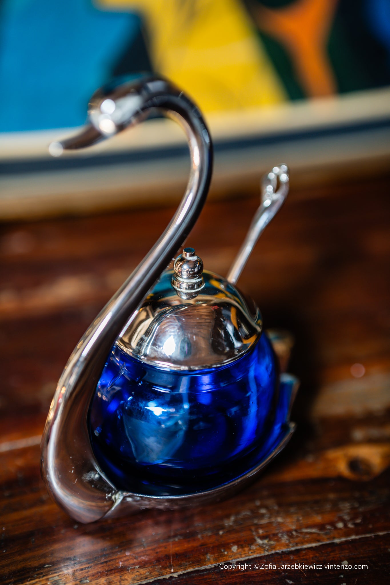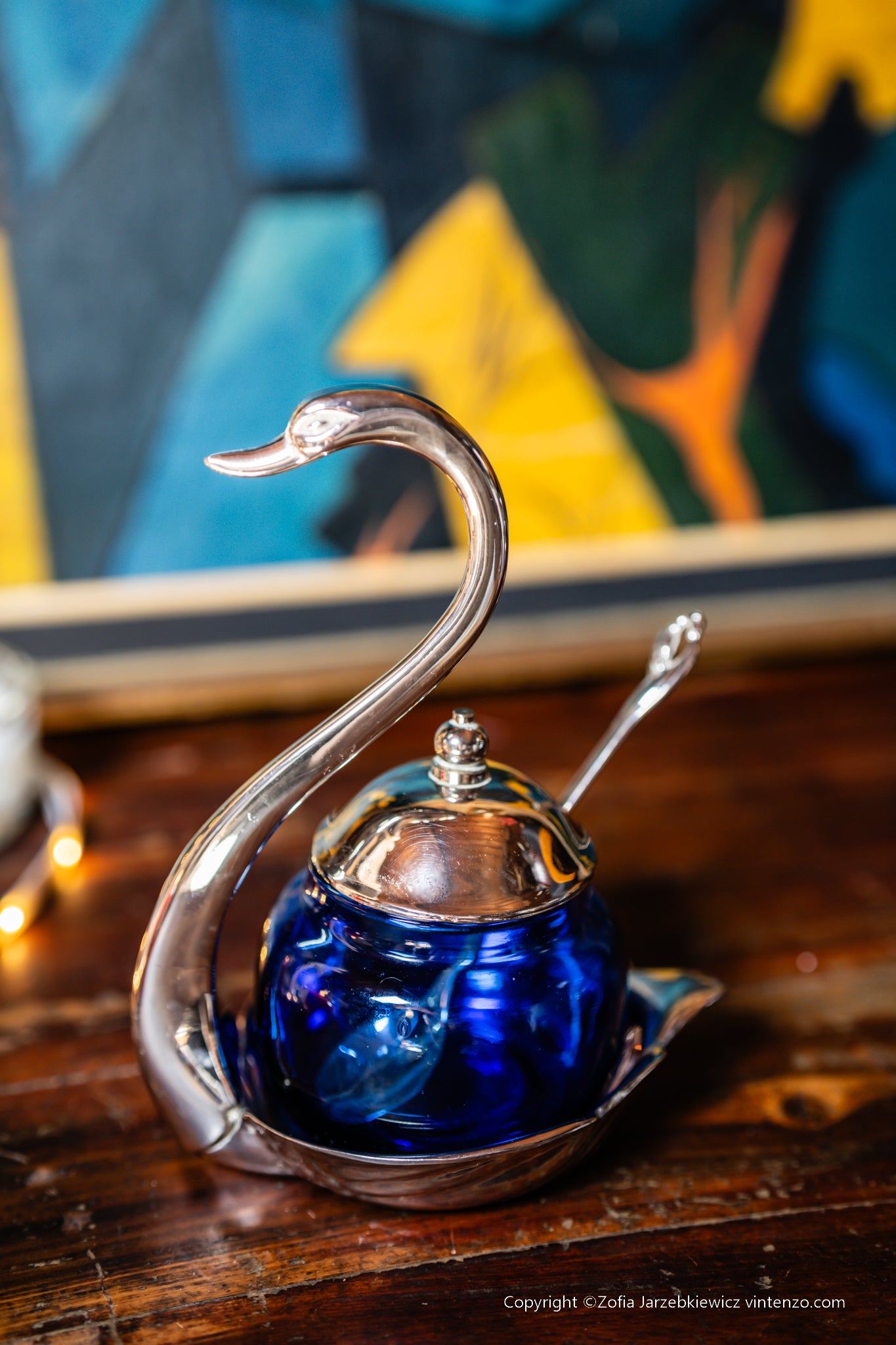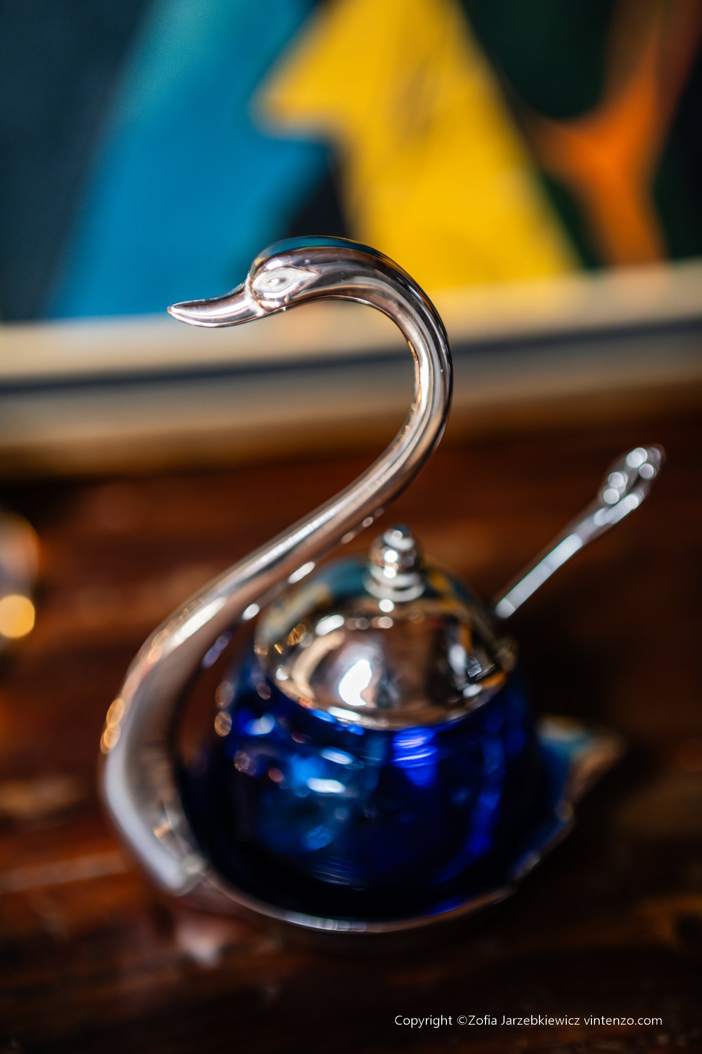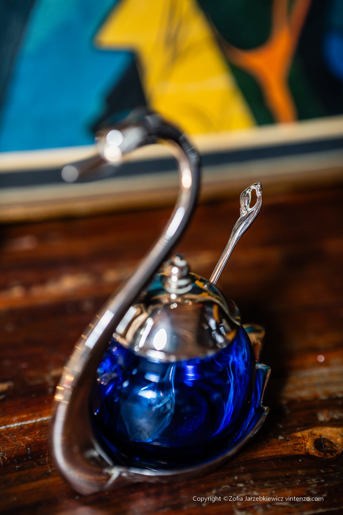 A graceful silver-plated piece featuring an elegant swan design and a striking deep blue glass insert. Ideal for serving sugar or jam, this unique bowl adds a touch of vintage charm to any table setting. Please note: a tiny chip on the glass, visible in one of the photos.