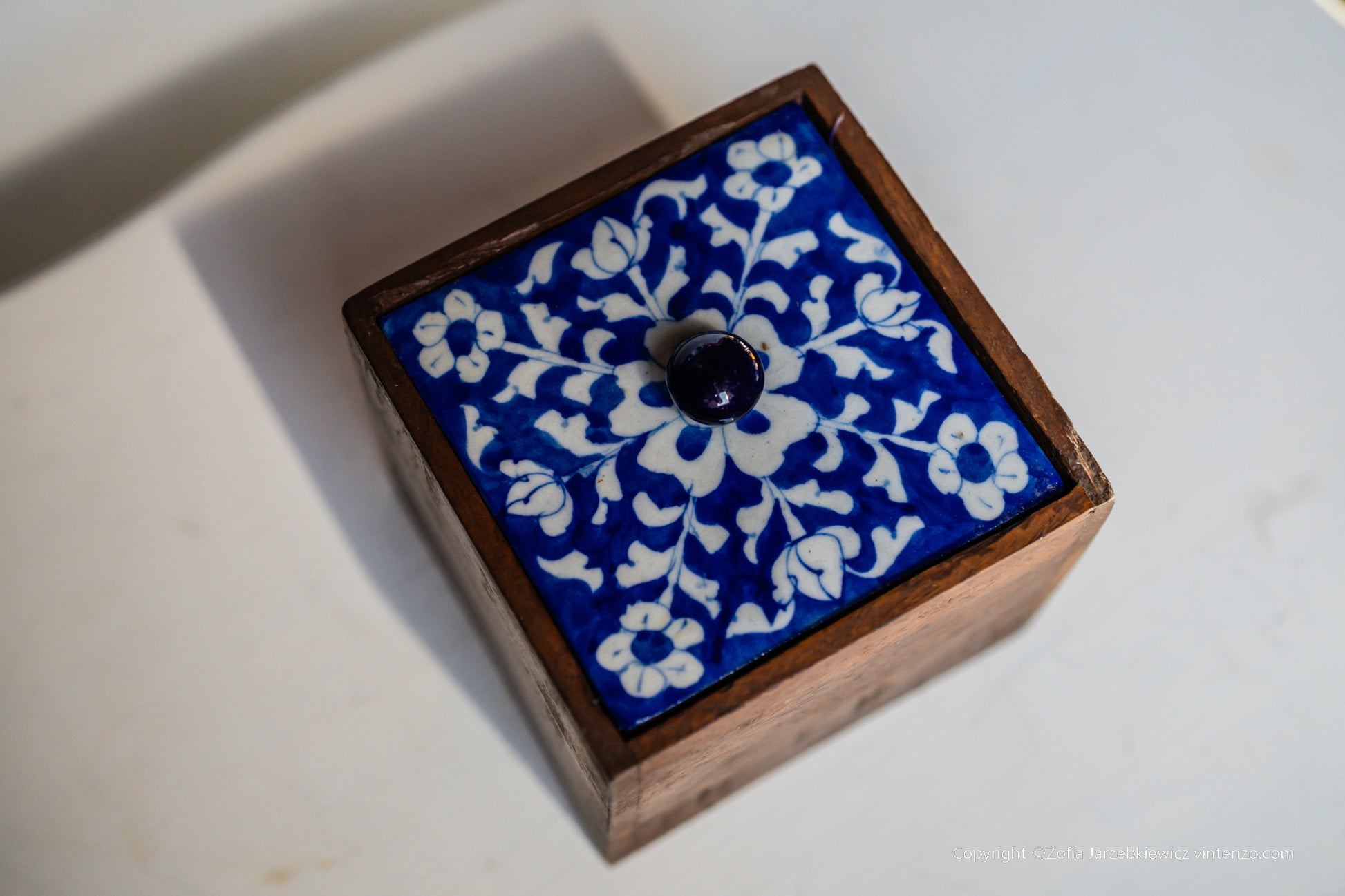 Vintage Wooden Box with Ceramic Blue Pattern Lid